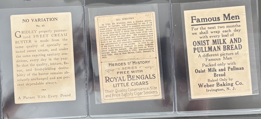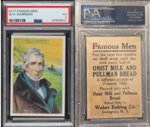 - D117 “Famous Men” Series (circa 1917–1919): Distributed with Onist Milk and Pullman Bread, both produced by the Weber Baking Company of Irvington, New Jersey. These ultra-thin cards lacked biography on the back and featured exclusive product branding.