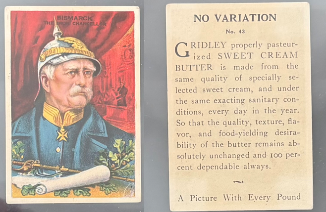 - F130 Gridley Butter Cards (late 1920s): Issued by the Gridley Dairy Company, headquartered in Milwaukee, Wisconsin, one of the largest sweet cream butter producers in the state. By 1928, Gridley Dairy used over 30,000 cows and produced millions of pounds of butter annually.