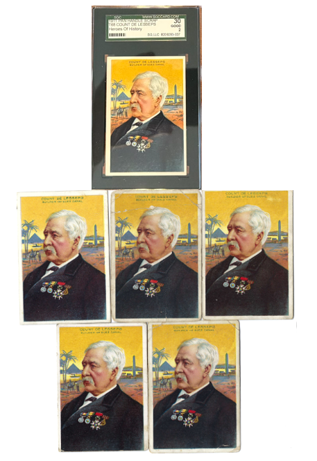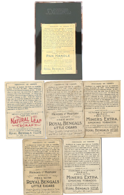 De Lesseps is one of only a few foreign figures to appear across all major scrap brand lines, indicating his broad inclusion in educational tobacco premiums despite lacking American roots.