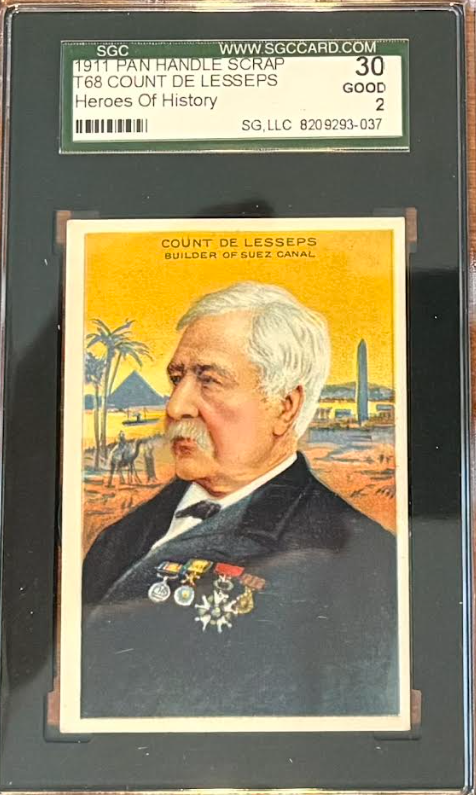 Ferdinand de Lesseps appears in various international or “world builder” thematic T68 groupings. His back-run includes examples from Factory 10 (New Jersey – Pan Handle) and Factory 17 (Virginia – Royal Bengals), supporting geographic distribution theories. No known error or blank-back examples have surfaced.
