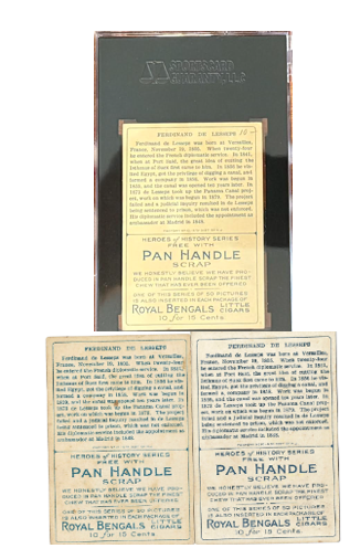 De Lesseps cards maintain high lithographic quality across both Factory 2 and 17. Print clarity is consistent, with minor differences in border thickness and ink warmth. His presence across Miners Extra, Natural Leaf, and both shades of Pan Handle Scrap suggests that his card was circulated across various tobacco product channels, despite his non-American status.