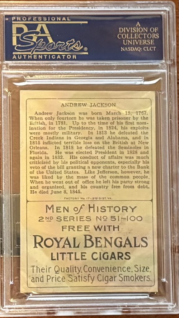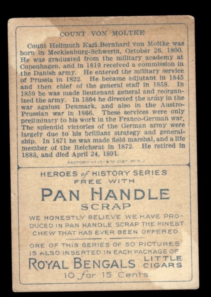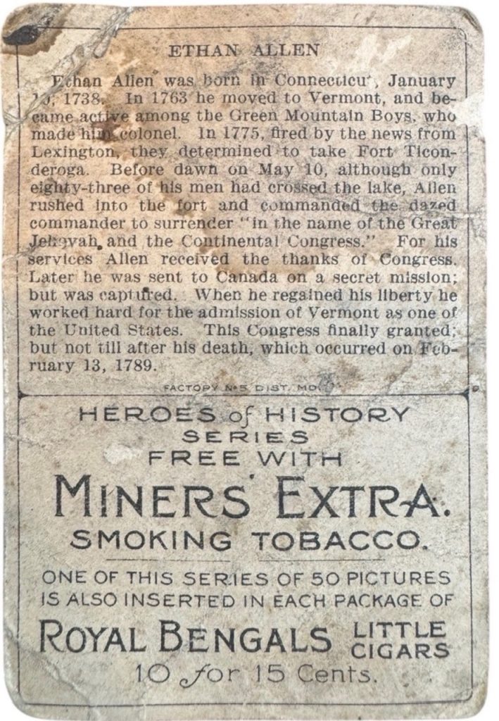 In the golden age of tobacco advertising, trading cards were never intended to survive in pristine condition. They were functional objects, inserted into packages of chewing tobacco or cigars, handled in retail environments, and exposed to oils, humidity, and organic material over time. Today, many T68 Heroes of History cards carry the physical imprint of that origin in the form of tobacco staining.