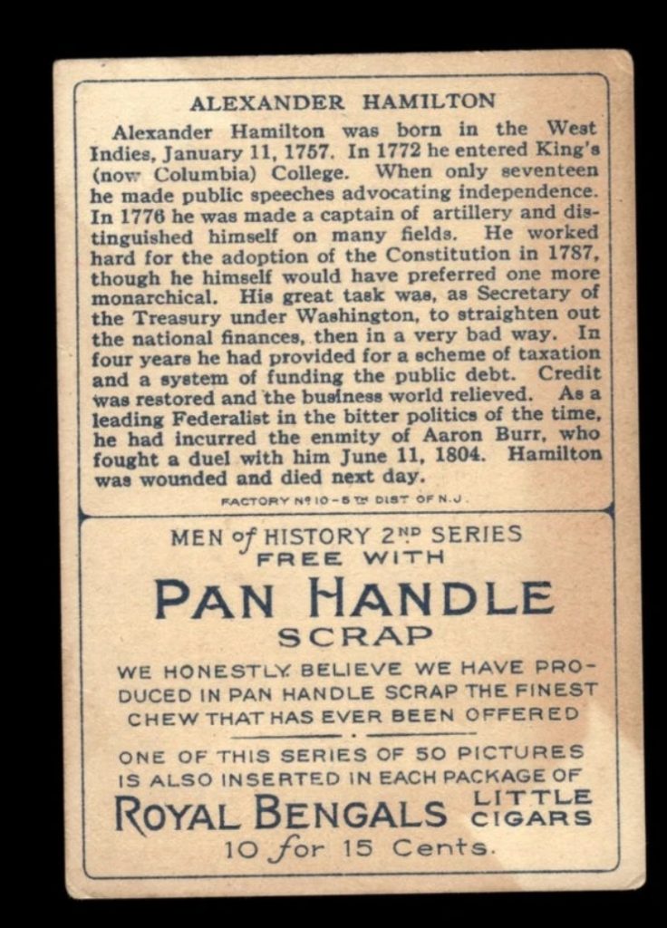 The Hamilton example displays minimal discoloration, limited to subtle edge toning and faint background warmth. This type of staining indicates indirect environmental exposure, likely from proximity within packaging rather than direct contact with tobacco material. The card retains a largely original paper tone with only slight influence from its surroundings.