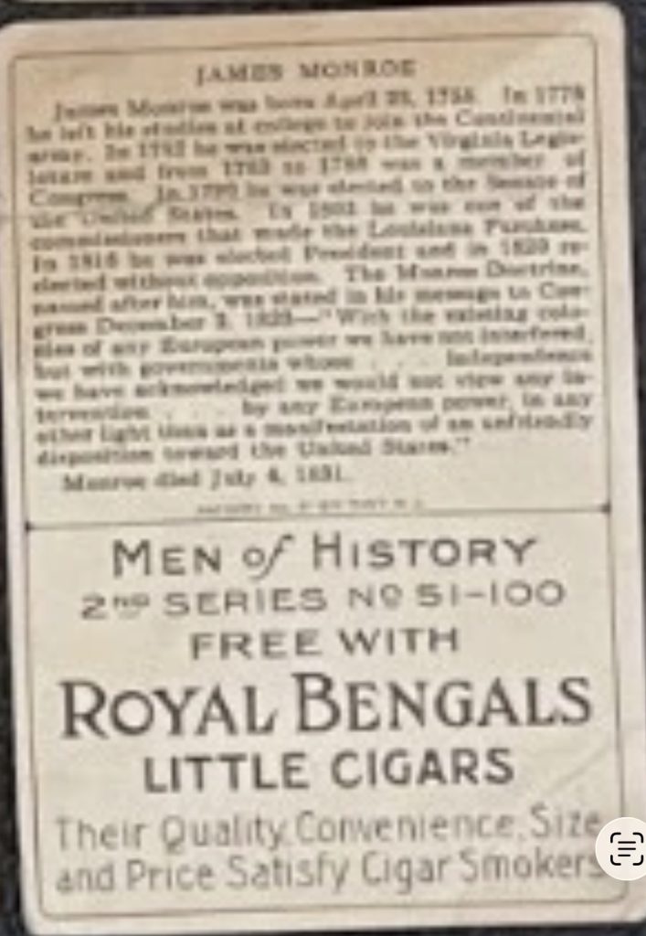 By comparison, cigar-associated distributions such as Royal Bengals typically exhibit lighter and more localized toning. The drier nature of cigar packaging, combined with less direct contact between the tobacco product and the inserted card, limited the degree of absorption. As a result, Royal Bengals backs more often show subtle edge toning, faint spotting, or minimal discoloration rather than the deeper saturation seen with chewing tobacco issues.