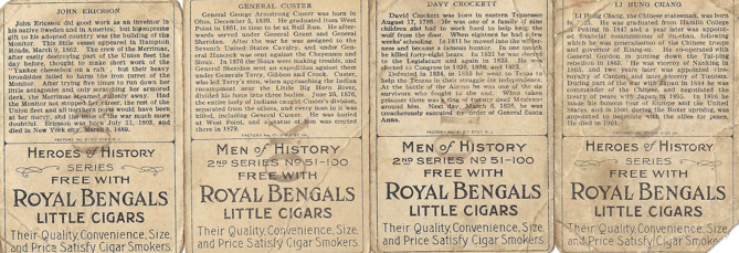 “Yes, sir,” I called back, already dabbing the Carter’s violet onto the worn rubber stamp. The crate was fresh—ten boxes of cigars packed tight, each one with a miniature marvel tucked inside: a Men of History tobacco card. Davy Crockett, General Custer, Captain John Ericsson, Li Hung Chang—names that sparked admiration or debate at barbershops and hotel lobbies across the country.